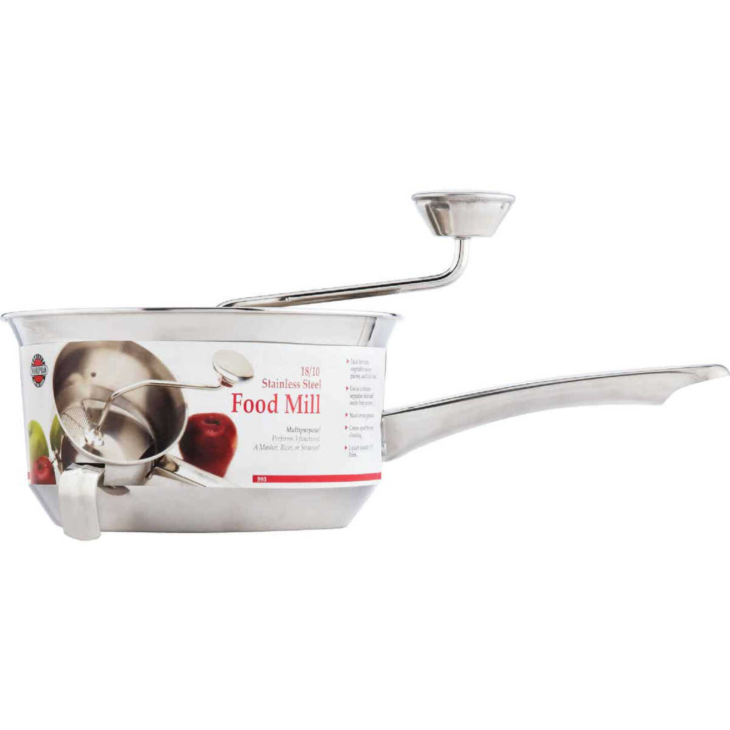 Stainless steel food mill is a masher, ricer, and strainer. Ideal for sauces and purees. 2 quart/2 liter.