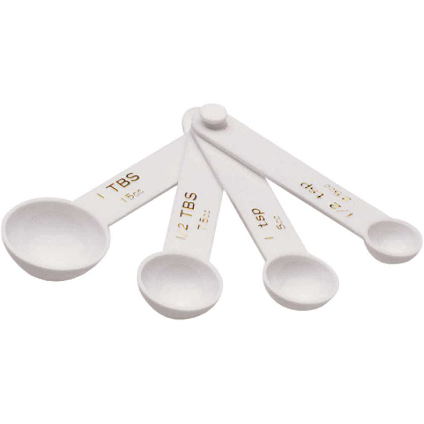 Durable plastic construction. Features both standard and metric measurements: 1/2 teaspoon, 1 teaspoon, 1/2 tablespoon, and 1 tablespoon. Dishwasher safe.