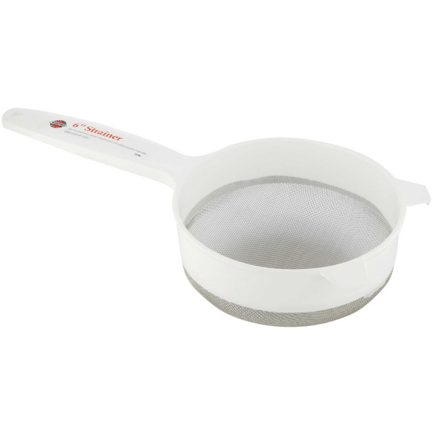 Dishwasher safe. 6 In. medium mesh strainer. Features 2 lips on 1 side and handle for conveniently resting on bowl.