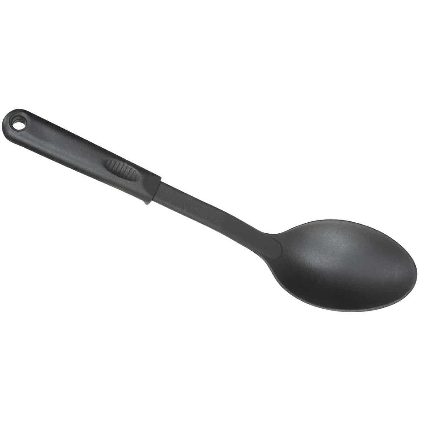 12 In. black nylon spoon makes stirring, lifting and transferring foods simple. Dishwasher safe, heat-resistant to 410 deg. F., nonskid easy-grip handles.