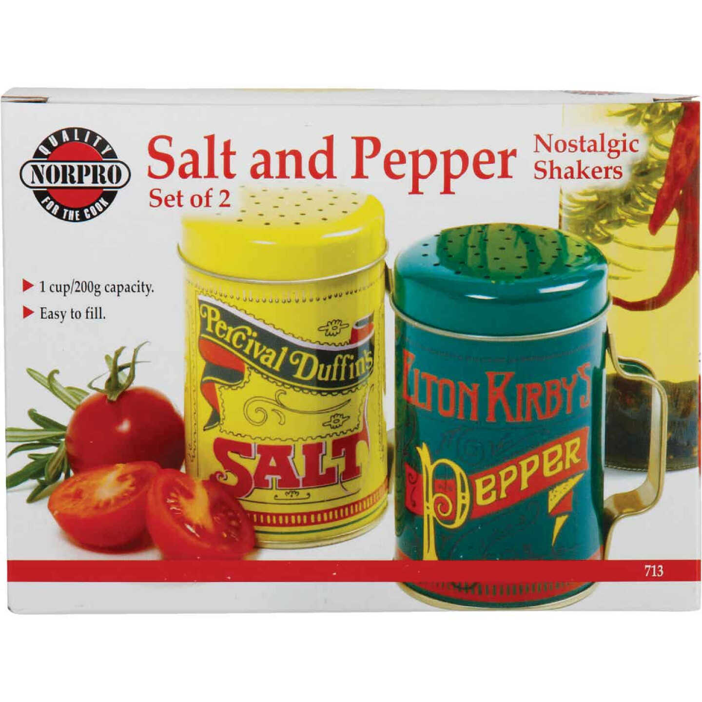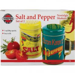Get the look of nostalgia with these attractively painted, tin plated steel salt and pepper shakers. Large capacity painted tin-plated steel shakers have large holes and hold 10 Oz. each. Height: 4 In.