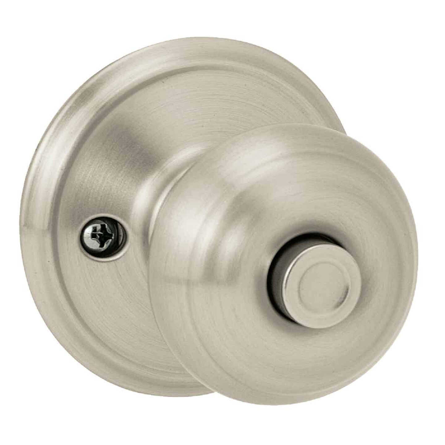 Bathroom/bedroom. For interior doors. Exterior knob locked by inside push-button. Unlocked by turning knob from interior or a narrow tool from exterior. Dual option latch includes 1/4″ round corner and 1″ circular drive-in latch, adjustable for 2-3/8″ or 2-3/4″ backsets. Strike: 1/4″ round corner full-lip strike. Grade 2 construction. Lifetime mechanical warranty. 10 year finish warranty.